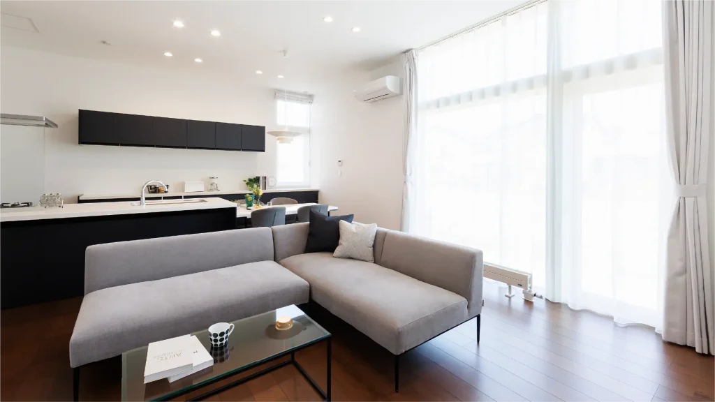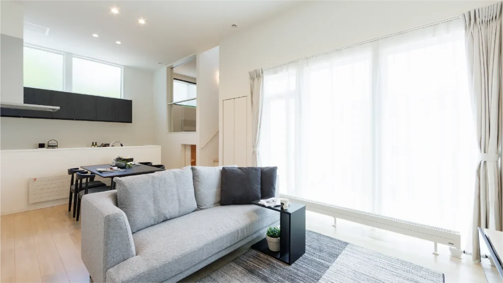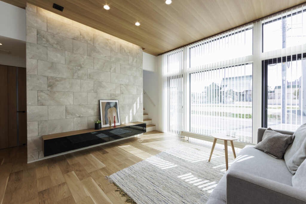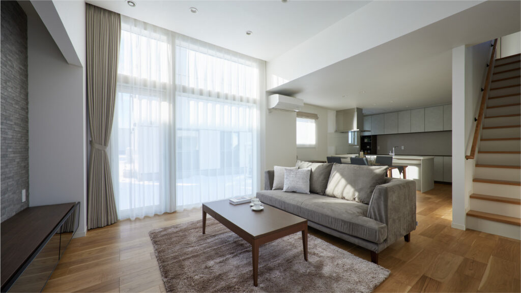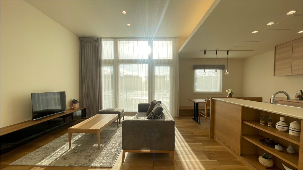 2階リビングはプライバシーが守られ、陽当たりの良いデザイン空間
